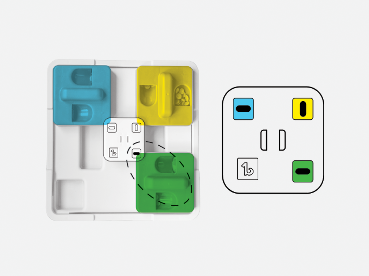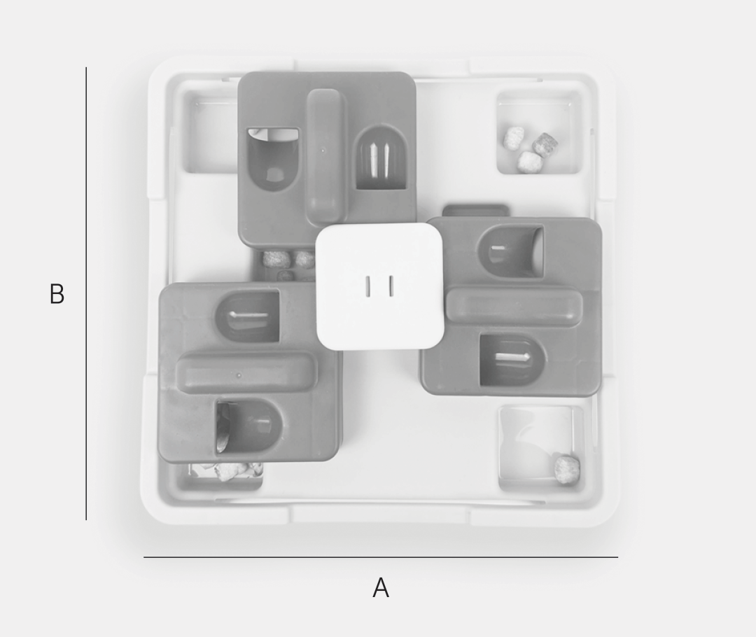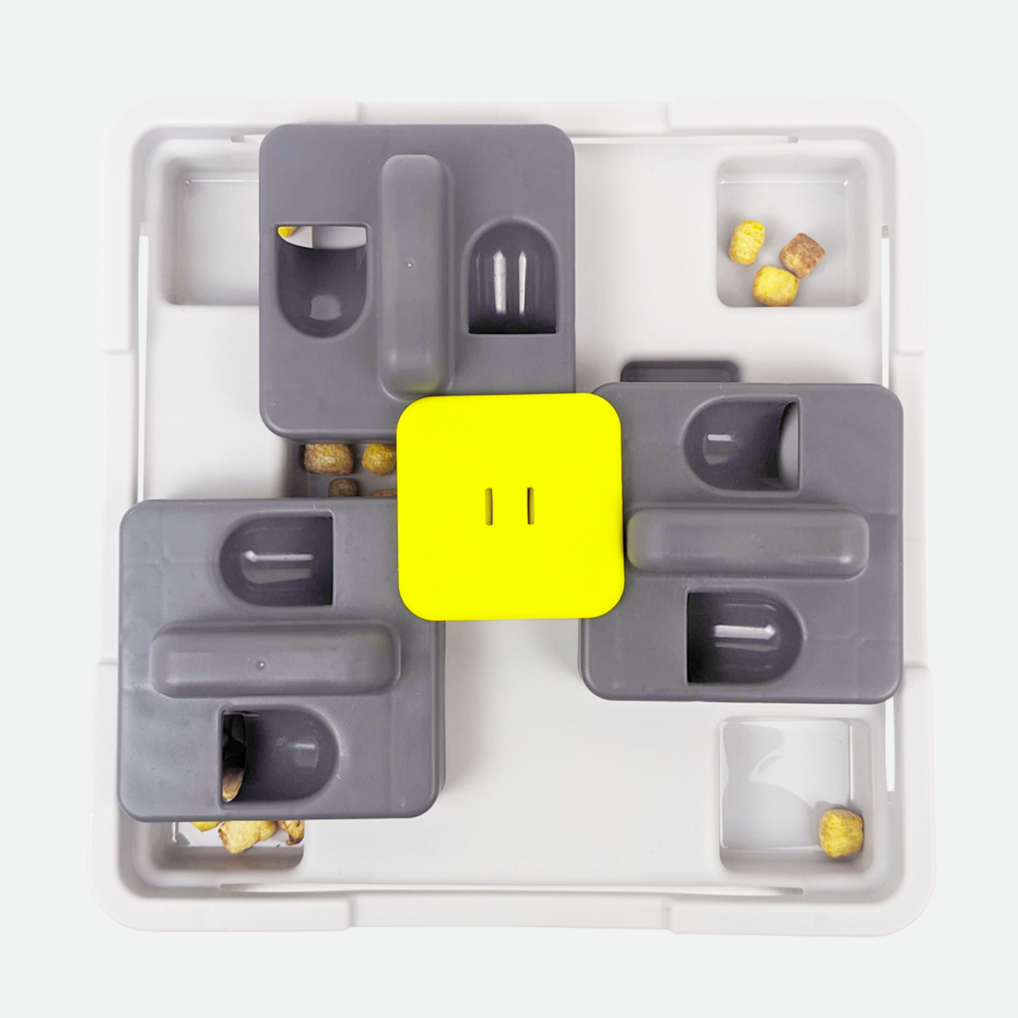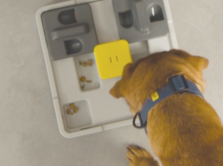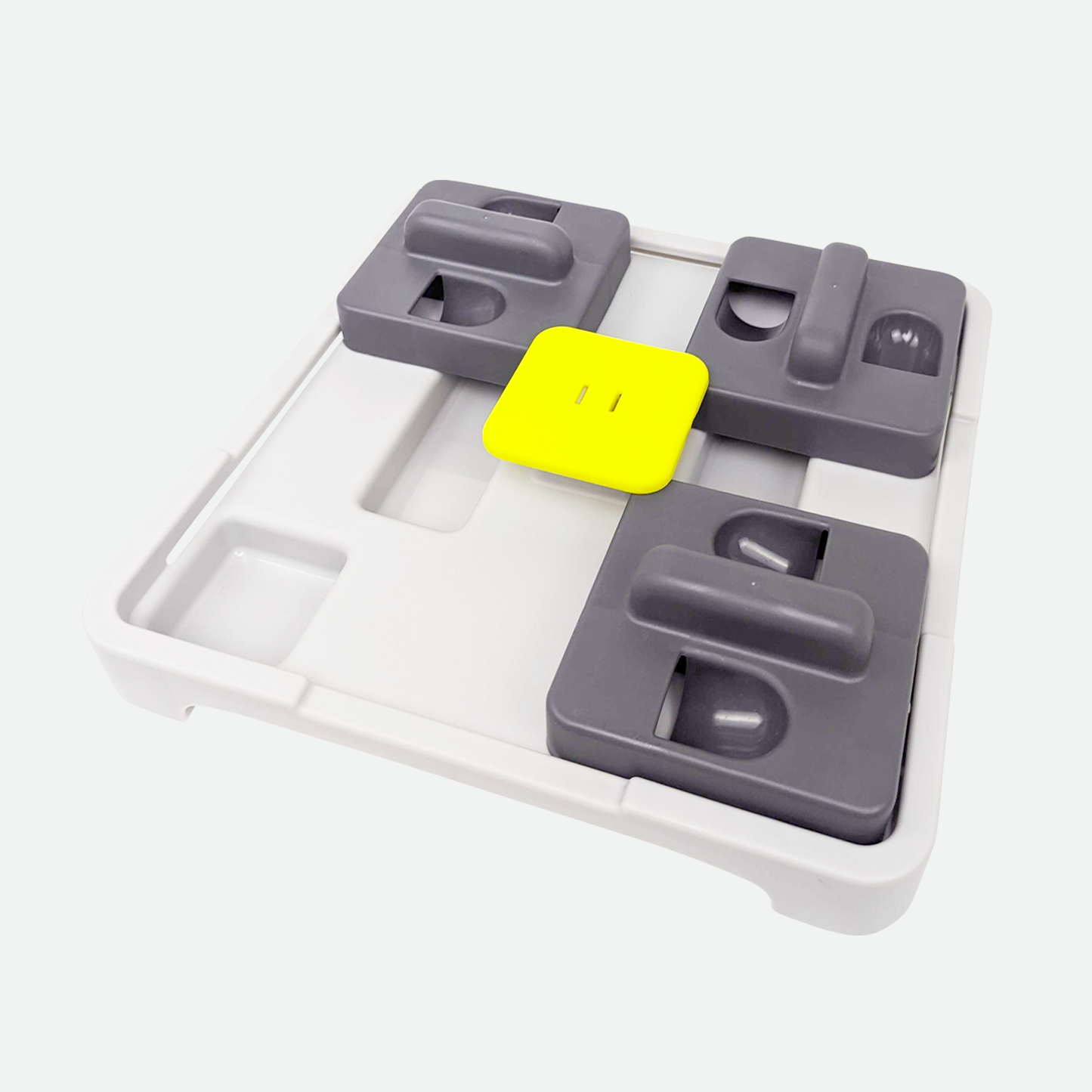 Le pousse & trouve demande à votre chien d'utiliser son museau ET ses pattes pour faire bouger les portes dans un mouvement de vas-et-vient. Chaque porte doit effectuer un « aller-retour », tandis qu’une autre porte vient bloquer sont mouvement. Le chien doit donc déplacer les bonnes portes au bon moment afin d’avoir accès aux croquettes et d’obtenir sa récompense. Son odorat et sa logique sont également mis à l'épreuve.