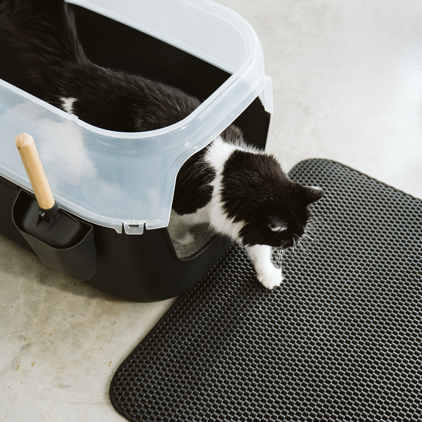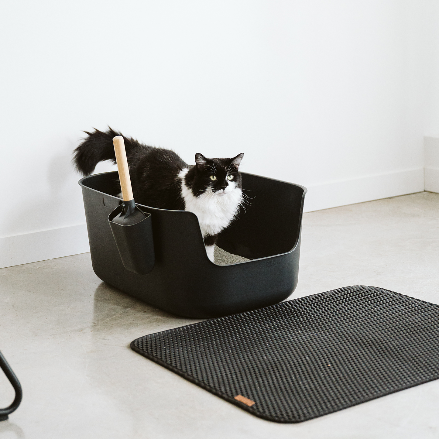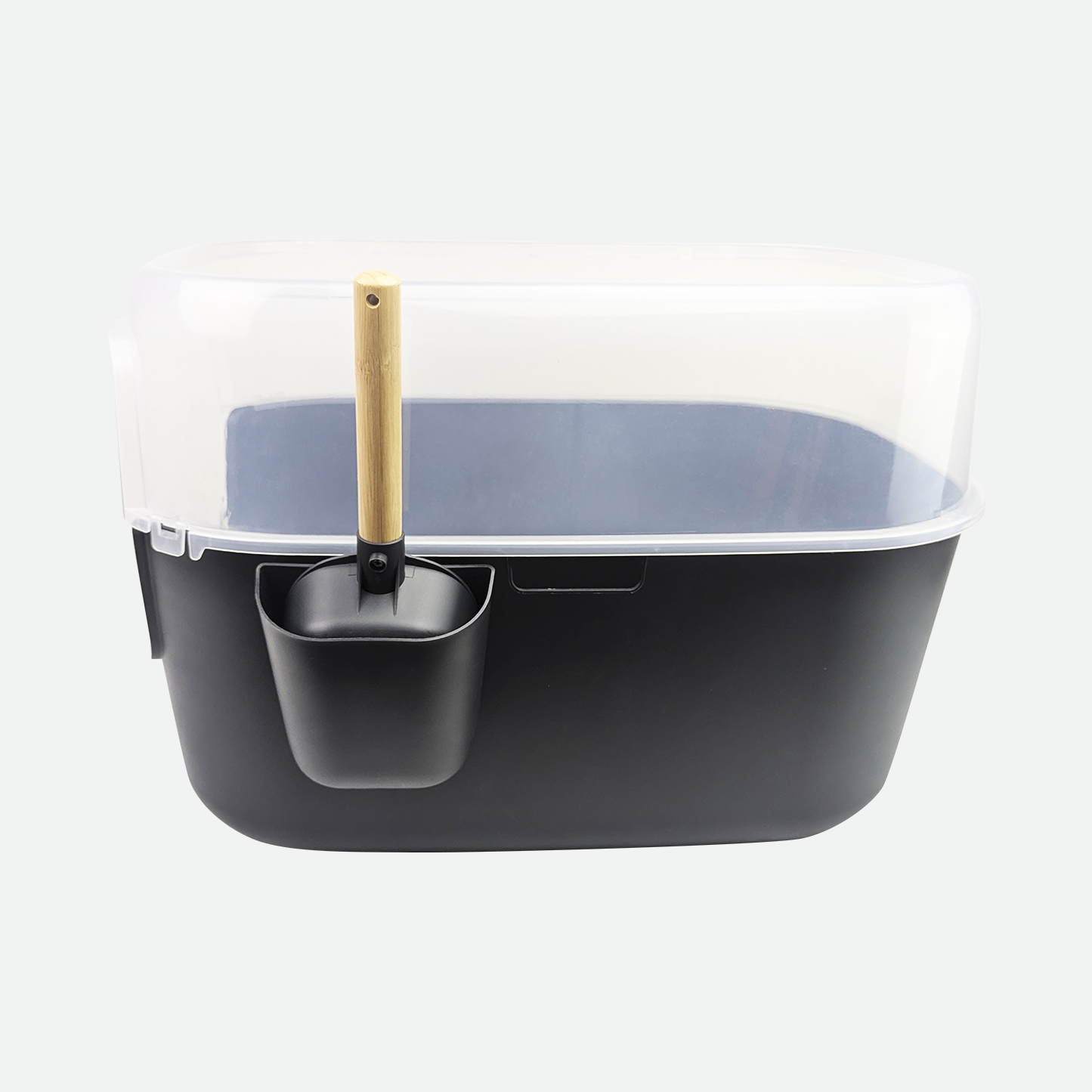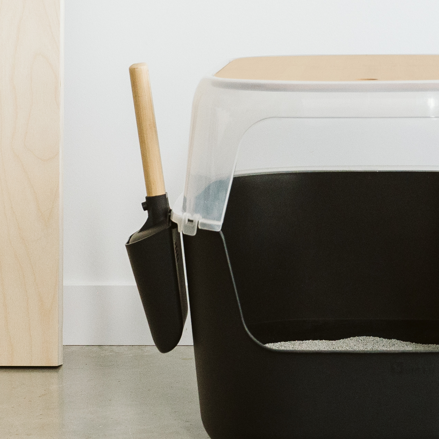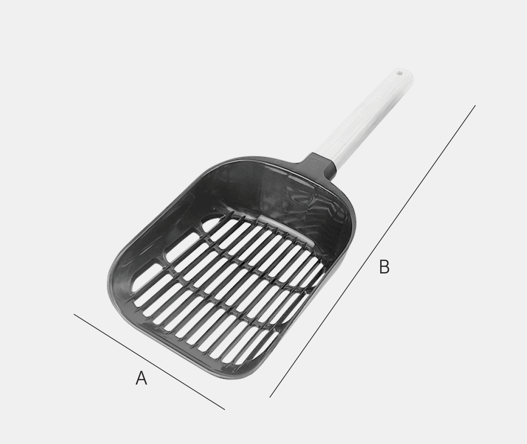 La pelle est équipée d'un manche en bambou robuste et confortable. Grâce à son socle, elle peut être rangée directement sur le bac, ce qui la rend facilement accessible et rend le nettoyage plus pratique. Une fente de chaque côté du bac est prévue à cet effet pour permettre de placer la pelle du côté désiré. La forme de la pelle permet un ramassage et un tamisage faciles de la litière, réduisant ainsi le gaspillage.